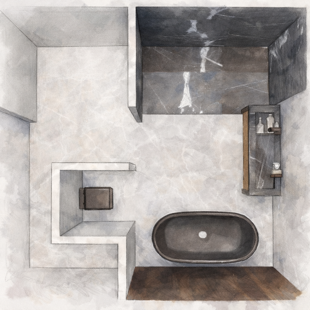 The primary bath was fully reimagined through a complete gut renovation. Layout was paramount. Multiple iterations were studied to refine circulation, sightlines, and functional adjacencies, ultimately arriving at a configuration that feels both intuitive and elevated.