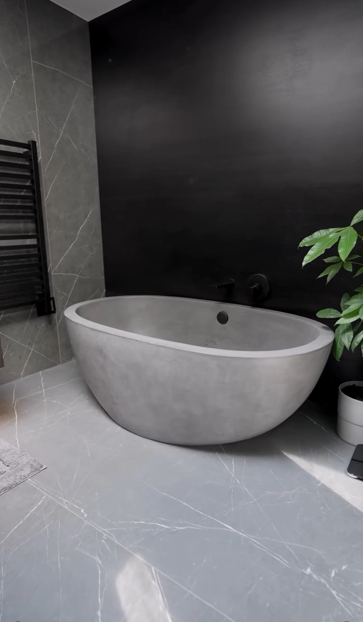 Within the primary bath, material contrast defines the experience. A carved stone tub establishes weight and permanence, balanced by the richness of a walnut feature wall. Integrated amenities, including a heated towel rack, elevate comfort without disrupting the architectural clarity of the space.